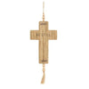 Fabric Christmas Tree is a plush tree wrapped in dark green linen fabric and secured upon a brown tree-stump base. The tree is decorated with rusted metal jingle bells attached to a thin metal garland. The bottom of the tree features a natural woven tan bow. Measures 11” high by 4.5” wide by 2.75” deep.