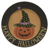 Halloween Scene Decorative Plate is a decorative wooden plate that features a smiling jack-o'-lantern man. He wears a black top hat with a graveyard scene on it, evoking the spooky feeling of Halloween. Plate has a cream colored background and measures 11.5" in diameter. Item is for decorative use only.