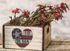Cream Distressed Sunflower Bucket is made of galvanized metal with a painted cream finish. It has signs of distress for a vintage finish and boasts a vintage stamp graphic with sunflowers. It has a metal handle with a wooden grip for easy transport and can be used to display florals or to store knick knacks. Looks great on a covered porch or set on an entryway console. Measures 8" wide by 8" high.