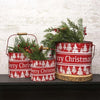Little Elf Threads Oval Metal Bucket is a galvanized bucket with a distressed red, white, and green finish. Bucket has two handles and embossed detailing and it reads, "Little Elf Threads Mittens, Scarves & Hats - Brrr It's Cold Outside-" in red and green text over a red, white and green painted finish. Bucket has distress marks for an aged look and it looks great filled with florals, fillers, or dolls. Measures 10" high by 19.75" wide by 10" deep.