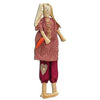 Alfred Bunny Doll is a freestanding fabric doll with a weighted bottom and primitive finish. Bunny features aged fabric with a dark finish and he wears a bow tie around his neck, a paper name tag that reads, "Alfred," and an orange fabric carrot in his left arm. Features wire whiskers, wired ears, black bead eyes, and stitched facial details. Measures 8" wide by 7" deep by 22" high.