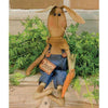 Harrison Bunny has a burlap pocket full of fabric carrots and a plaid scarf around his neck. He has rosy cheeks, floppy ears, and stands 10" tall.