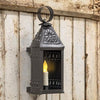 White Wash Homestead Lanterns sells as a set of three distressed and painted metal lanterns. They have corrugated roofs with metal loops attached at the top for hanging display. Small measures 6" wide by 14" high. Medium measures 8" wide by 17" high. Large measures 10" wide by 21" high