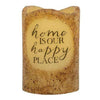 Better on the Farm Truck Timer Pillar has a burnt ivory, textured wax finish. The center of the 4.5” high by 3” diameter pillar is printed with an illustration of a pickup truck with a chicken perched on the back. It reads “Life is Better on the Farm.” It has a built-in timer that allows the candle to glow for 6 hours, then it turns off automatically for 18, relighting at the same time each day. It requires three AAA batteries, which are not included.