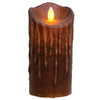 The Grungy Star Pillars are a pretty, rustic accent for lanterns, holders, hurricane vases, and candle groups. The LED pillar candle has a real wax sleeve, silicone-tipped flames, and a grungy wax coating, featuring star cutouts that glow when the pillar is lit. Handy built-in timer feature keeps pillar lit for 6 hours then switches off for 18, relighting the next day at the same time it was set. 6" H x 2-3/4" W, requires 3 AAA batteries (not included).