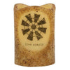 3"x4.5" is a battery-operated pillar candle that reads, "home is our happy place," over a grungy, textured wax finish. Pillar has a standard on/off switch and a built-in timer that runs for 6 hours, then off for 18 hours. It requires 3 AAA batteries (not included) and measures 4.5" high by 3" wide.