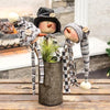 Buffalo Check Santa on Base is a stuffed primitive Santa doll on a sturdy wood block base. He is dressed in a red and black plaid suit with metal bell buttons and he holds a faux Christmas tree in one hand and a wooden star ornament in the other. His fuzzy beard is distressed and he has stitched facial features for a rustic feel. Measures 20" high by 6" wide by 4" deep.