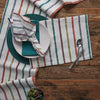 Merry Christmas Candle Mat is a primitive fabric mat that features a circular, red snowflake pattern and the phrase, "Merry Christmas." The mat is sewn with rustic stitching details for a homemade look. The back of the mat is a solid red felt. Measures 8½" in diameter.