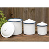 Enamel Canisters sell as a set of three. Canisters are food, oven and dishwasher safe. The small size measures 3" high by 3½" wide. The medium size measures 4" high by 4½" wide. The large size measures 5" high by 5" wide. Do not microwave.