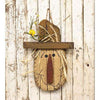Hanging Fall Owl is a rustic wood piece that is American made. It features a jute rope at the back for wall display and is painted orange and brown with white distress marks to mimic age. Owl has a raffia bow with fall leaf accents and looks great on a covered porch or as an accent to a full fall display.