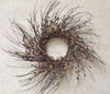 Burgundy/Gold Pip Twig Wreath features burgundy and old gold berries on wispy brown stems. It is 16" in diameter.