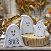The Boo Crew Blocks are a set of three decorative wooden blocks with a white painted finish and worn edges. The horizontal block reads “Boo Crew” in vintage black lettering with skeleton bone graphics. The square block reads “Eat Drink and Be Scary” in vintage black lettering. The third block is a ghost silhouette with painted eyes. These blocks can be stacked or displayed alone, bringing a spooky touch to a riser, tray, shelf, or table during the Halloween season. Boo Crew block measure 2” high by 6” wide by .75” deep. Eat block measures 3.5” high by 3” wide by .75” deep. Ghost block measures 3.5” high by 2.5” wide by .75” deep.