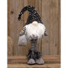 Large Dangle Leg Plush Fuzzy Gray Santa Gnome is a stuffed gnome figure with a weighted bottom and dangling legs. Gnome has a round nose, fluffy, faux-fur beard with long dangling red and gray striped fabric legs with knit booties and fur cuffs. Gnome has a tall, wired, gray knit hat and looks great on a shelf, console table, or riser and measures 14 high by 6 wide and 6 deep, with 10 long dangle legs.
