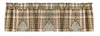 The Scotch Pine Lined Patch Valance pairs a small scale woodsy plaid of evergreen, brown, and tan with appliqued tan fabric blocks containing an embroidered pinecone and pine bough.