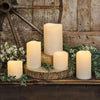 Soft Glow Flicker LED Candles sell as a set of three wax-dipped pillar candles with an LED flame that flickers for a traditional candle experience. Candle runs on a six hour timer, then goes off for 18 hours, repeating the cycle automatically each day once they've been turned on and the set comes with a remote control for easy on/off use. Nine AAA batteries are required to operate the set (batteries not included) and they measure 4" high by 3" in diameter (small); 5" high by 3" in diameter (medium); 6" high by 3" in diameter (large).