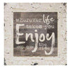 Dad's Fix It Shop Sign is a hanging wooden sign made from two wood boards that are attached together by a metal chain. Boards have a distressed, white painted finish. The top board states, "Dad's Fix It Shop," in rusty metal lettering, and "open 24 hours," painted below it in black paint. The bottom board features a pair of metal hammers that are crossed in front of each other. Sign includes a rusty wire loop hanger as well as two sawtooth hangers on the back. This sign is perfect for displaying in a man cave or garage, or given as a gift on Father's Day. Measures 11.5" high by 18" wide and .25" deep (hanger adds 5.5" to height).