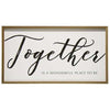 Enjoy the Little Things Sign is a rustic sign that features white script on a distressed, dark woodgrain background. Sign sits recessed within a distressed, white painted wooden frame. Design is accented with a black, decorative metal handle on each side for a unique added touch. Hangs on two d-ring loops. Measures 8" high by 39" wide and 1" deep. Please note: item must be purchased in quantities of four due to shipping requirements.