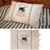 Sunny Feed Farmhouse Stripe King Pillow Sham is a king-sized, 100% cotton pillow case. Sham is off-white and has faded black lettering that reads, "Sunny Feed - Something to Cluck About - Rise and Shine Grain Co." and it is accented by the black silhouette of a hen and chick in the center. Sham has striped detailing and features two black lines on either side of the illustration and it measures 20" high by 36"' wide.