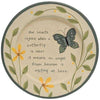 Bless Our Home Vintage Metal Wall Plaque is a sign made of painted white metal with distressed black trim and embossed sunflowers and text.  It reads, "bless our home," in green lettering and boasts mild distress marks for an aged finish. It has two keyhole slots for hanging and looks darling above a mantelpiece or an entryway console. Measures 16.5" wide by 16.5" high.