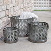 Graywashed Willow Planter Baskets is a set of three natural willow baskets with a rustic graywash finish. Planter baskets come without handles for a sleek design and they each have a plastic liner for use with real or artificial florals.  Baskets have a traditional woven look and are excellent for storing electronics, knick knacks, florals, fillers, and more! Small measures 6" diameter by 4.5" high;  medium measures 8" diameter by 6" high; large measures 10" diameter by 7.25" high.