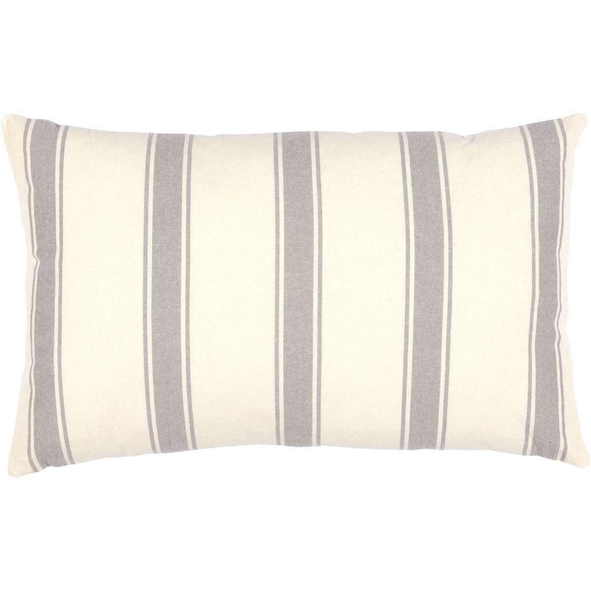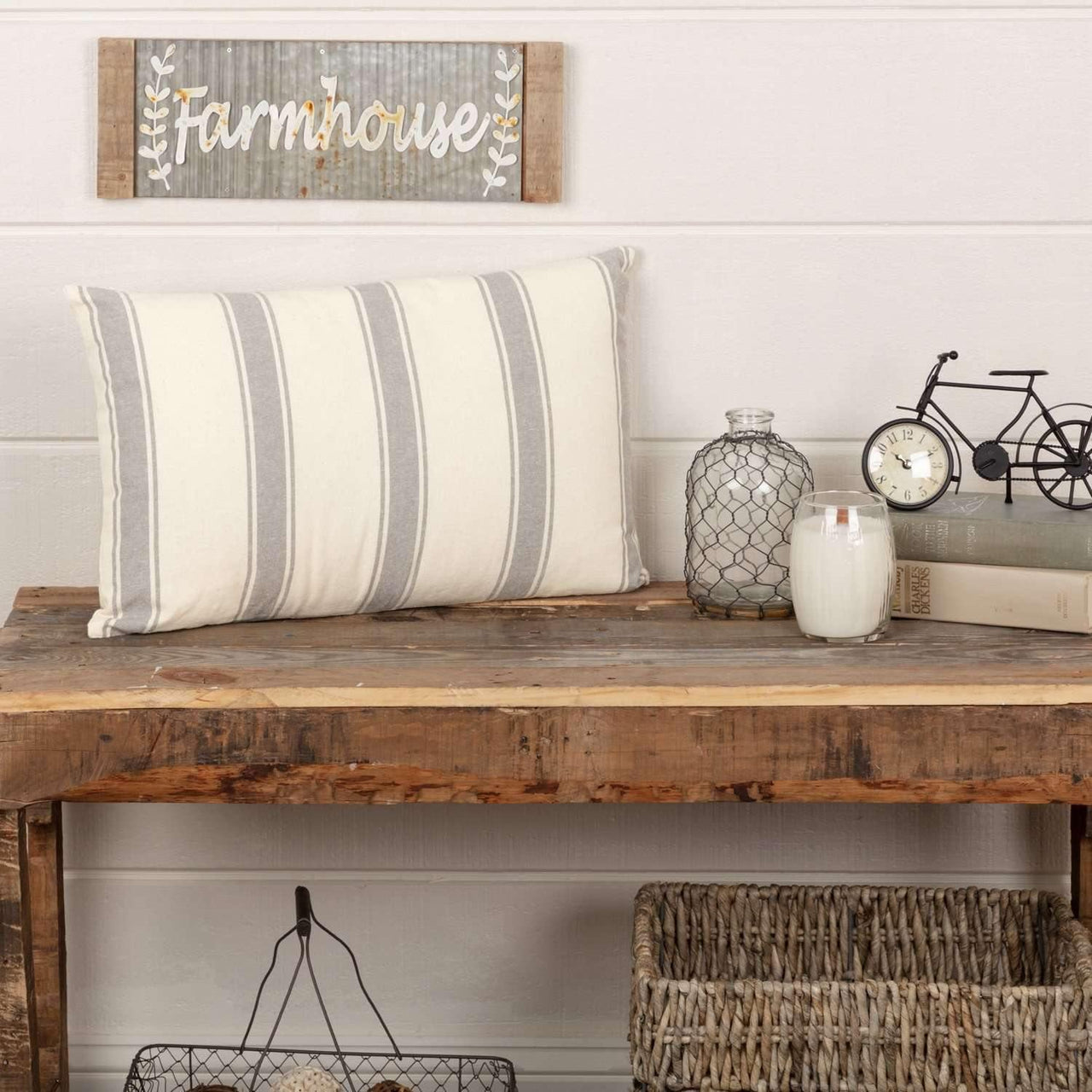Elegant enlarged ticking stripes - a farmhouse staple - in nickel grey are placed on a creme fabric, giving the 14x22 Grace Fabric Pillow a spacious and fresh look. 100% cotton, reverses same as front, and includes 2 wooden buttons for enclosure.