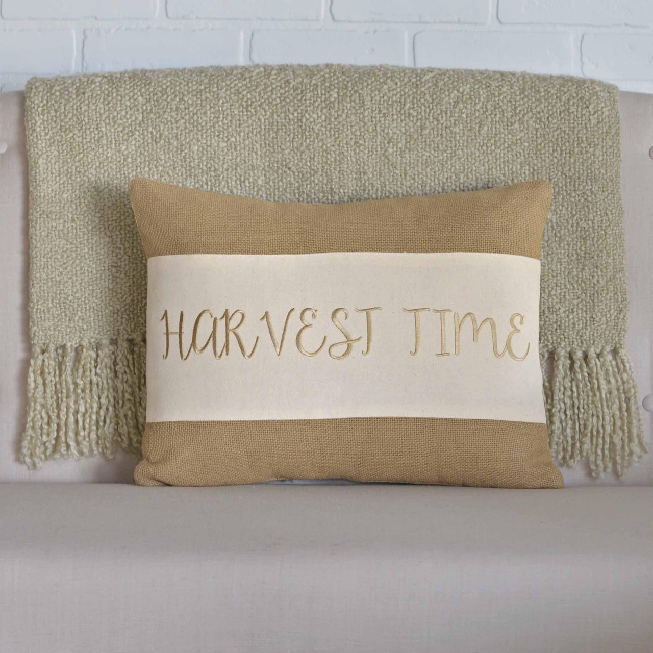 The Harvest Time Pillow 14x18 comes filled and is a soft natural cotton burlap with a creme cotton canvas. The wording is shown across the appliqued strip in the center.