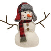 Brad Snowman Ornament is a stuffed snowman ornament with a string hanger attached at the back. Snowman wears a gray knit cap with a buffalo check bow tie and red and black buffalo check scarf. He has rosy cheeks, black beads for his eyes and smile, and has a pine floral with red berries pinned to his side. Snowman has a flat base and can be used to spruce up an end table as well as a tree. Measures 8" high by 3.5" wide.