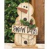 Light Up Snowman w/Pine & Cones, 2 Ft., is a wooden light-up box with a snowman design. It is mostly unpainted, but boasts weathered black paint on its hat and distressed orange paint on its nose. Snowman is accented by a pine and pine cone spray and features two holes on the front for light to shine through and a hole on the back panel for its cord. Cord has a candelabra socket with a 7 watt bulb that lights up the snowman's body and it is open on the bottom for use with flameless candles. Made in the USA. Measures 24” high by 11” wide by 5” deep.