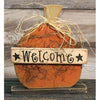 The Whimsy Pumpkin Tray features 3 cartoon-styled pumpkins on a mustard and tan striped backrground, each with a different pattern: swirls, stars, and square spirals. Lightly distressed oval pressed wood decorative tray, 5-1/2" high and 15" long.