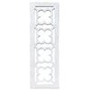 Distressed White Architectural Cutout is a wooden window cutout with a detailed, architectural design. Add dimension to any wall with this modern farmhouse piece that has marquise shaped cutouts. Item is painted white and has lightly distressed edges. Hangs on a sawtooth hanger. Measures 36" high by 11.25" wide and .5" deep.