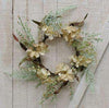 Snowdrift Pine Ring has several pinecones that sit among bushy pine branches. The ring has a thick coat of snow that fades on the pine branches to expose hints of bare needles toward the center where the branches gather. Measures 4.5” in diameter inside the ring and 10” in diameter from the outside edges.